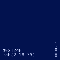 Цвет #02124F в цветовой модели RGB обозначается тремя октетами (2, 18, 79) в десятичном формате и #02124F в шестнадцатиричном (hex) формате, которые являются интенсивностью красного 2 (hex 02), интенсивность зелёного 18 (hex 12) и интенсивность синего 79 (hex 4F).