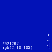 Цвет #0212B7 в цветовой модели RGB обозначается тремя октетами (2, 18, 183) в десятичном формате и #0212B7 в шестнадцатиричном (hex) формате, которые являются интенсивностью красного 2 (hex 02), интенсивность зелёного 18 (hex 12) и интенсивность синего 183 (hex B7).