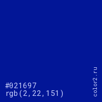 Цвет #021697 в цветовой модели RGB обозначается тремя октетами (2, 22, 151) в десятичном формате и #021697 в шестнадцатиричном (hex) формате, которые являются интенсивностью красного 2 (hex 02), интенсивность зелёного 22 (hex 16) и интенсивность синего 151 (hex 97).