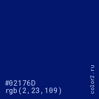 Цвет #02176D в цветовой модели RGB обозначается тремя октетами (2, 23, 109) в десятичном формате и #02176D в шестнадцатиричном (hex) формате, которые являются интенсивностью красного 2 (hex 02), интенсивность зелёного 23 (hex 17) и интенсивность синего 109 (hex 6D).