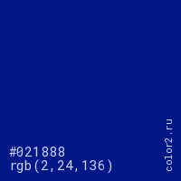 Цвет #021888 в цветовой модели RGB обозначается тремя октетами (2, 24, 136) в десятичном формате и #021888 в шестнадцатиричном (hex) формате, которые являются интенсивностью красного 2 (hex 02), интенсивность зелёного 24 (hex 18) и интенсивность синего 136 (hex 88).