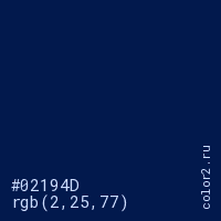 Цвет #02194D в цветовой модели RGB обозначается тремя октетами (2, 25, 77) в десятичном формате и #02194D в шестнадцатиричном (hex) формате, которые являются интенсивностью красного 2 (hex 02), интенсивность зелёного 25 (hex 19) и интенсивность синего 77 (hex 4D).