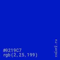Цвет #0219C7 в цветовой модели RGB обозначается тремя октетами (2, 25, 199) в десятичном формате и #0219C7 в шестнадцатиричном (hex) формате, которые являются интенсивностью красного 2 (hex 02), интенсивность зелёного 25 (hex 19) и интенсивность синего 199 (hex C7).