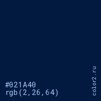 Цвет #021A40 в цветовой модели RGB обозначается тремя октетами (2, 26, 64) в десятичном формате и #021A40 в шестнадцатиричном (hex) формате, которые являются интенсивностью красного 2 (hex 02), интенсивность зелёного 26 (hex 1A) и интенсивность синего 64 (hex 40).