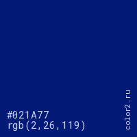 Цвет #021A77 в цветовой модели RGB обозначается тремя октетами (2, 26, 119) в десятичном формате и #021A77 в шестнадцатиричном (hex) формате, которые являются интенсивностью красного 2 (hex 02), интенсивность зелёного 26 (hex 1A) и интенсивность синего 119 (hex 77).