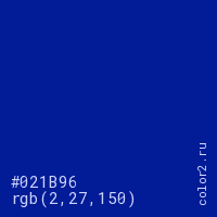 Цвет #021B96 в цветовой модели RGB обозначается тремя октетами (2, 27, 150) в десятичном формате и #021B96 в шестнадцатиричном (hex) формате, которые являются интенсивностью красного 2 (hex 02), интенсивность зелёного 27 (hex 1B) и интенсивность синего 150 (hex 96).