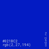 Цвет #021BC2 в цветовой модели RGB обозначается тремя октетами (2, 27, 194) в десятичном формате и #021BC2 в шестнадцатиричном (hex) формате, которые являются интенсивностью красного 2 (hex 02), интенсивность зелёного 27 (hex 1B) и интенсивность синего 194 (hex C2).