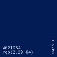 Цвет #021D54 в цветовой модели RGB обозначается тремя октетами (2, 29, 84) в десятичном формате и #021D54 в шестнадцатиричном (hex) формате, которые являются интенсивностью красного 2 (hex 02), интенсивность зелёного 29 (hex 1D) и интенсивность синего 84 (hex 54).