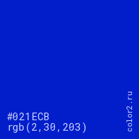 Цвет #021ECB в цветовой модели RGB обозначается тремя октетами (2, 30, 203) в десятичном формате и #021ECB в шестнадцатиричном (hex) формате, которые являются интенсивностью красного 2 (hex 02), интенсивность зелёного 30 (hex 1E) и интенсивность синего 203 (hex CB).