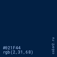 Цвет #021F44 в цветовой модели RGB обозначается тремя октетами (2, 31, 68) в десятичном формате и #021F44 в шестнадцатиричном (hex) формате, которые являются интенсивностью красного 2 (hex 02), интенсивность зелёного 31 (hex 1F) и интенсивность синего 68 (hex 44).