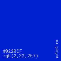 Цвет #0220CF в цветовой модели RGB обозначается тремя октетами (2, 32, 207) в десятичном формате и #0220CF в шестнадцатиричном (hex) формате, которые являются интенсивностью красного 2 (hex 02), интенсивность зелёного 32 (hex 20) и интенсивность синего 207 (hex CF).