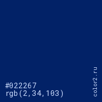Цвет #022267 в цветовой модели RGB обозначается тремя октетами (2, 34, 103) в десятичном формате и #022267 в шестнадцатиричном (hex) формате, которые являются интенсивностью красного 2 (hex 02), интенсивность зелёного 34 (hex 22) и интенсивность синего 103 (hex 67).