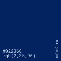 Цвет #022360 в цветовой модели RGB обозначается тремя октетами (2, 35, 96) в десятичном формате и #022360 в шестнадцатиричном (hex) формате, которые являются интенсивностью красного 2 (hex 02), интенсивность зелёного 35 (hex 23) и интенсивность синего 96 (hex 60).