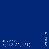 Цвет #022779 в цветовой модели RGB обозначается тремя октетами (2, 39, 121) в десятичном формате и #022779 в шестнадцатиричном (hex) формате, которые являются интенсивностью красного 2 (hex 02), интенсивность зелёного 39 (hex 27) и интенсивность синего 121 (hex 79).