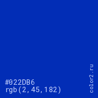 Цвет #022DB6 в цветовой модели RGB обозначается тремя октетами (2, 45, 182) в десятичном формате и #022DB6 в шестнадцатиричном (hex) формате, которые являются интенсивностью красного 2 (hex 02), интенсивность зелёного 45 (hex 2D) и интенсивность синего 182 (hex B6).
