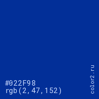 Цвет #022F98 в цветовой модели RGB обозначается тремя октетами (2, 47, 152) в десятичном формате и #022F98 в шестнадцатиричном (hex) формате, которые являются интенсивностью красного 2 (hex 02), интенсивность зелёного 47 (hex 2F) и интенсивность синего 152 (hex 98).