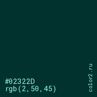 Цвет #02322D в цветовой модели RGB обозначается тремя октетами (2, 50, 45) в десятичном формате и #02322D в шестнадцатиричном (hex) формате, которые являются интенсивностью красного 2 (hex 02), интенсивность зелёного 50 (hex 32) и интенсивность синего 45 (hex 2D).