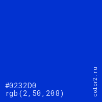 Цвет #0232D0 в цветовой модели RGB обозначается тремя октетами (2, 50, 208) в десятичном формате и #0232D0 в шестнадцатиричном (hex) формате, которые являются интенсивностью красного 2 (hex 02), интенсивность зелёного 50 (hex 32) и интенсивность синего 208 (hex D0).