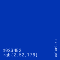 Цвет #0234B2 в цветовой модели RGB обозначается тремя октетами (2, 52, 178) в десятичном формате и #0234B2 в шестнадцатиричном (hex) формате, которые являются интенсивностью красного 2 (hex 02), интенсивность зелёного 52 (hex 34) и интенсивность синего 178 (hex B2).