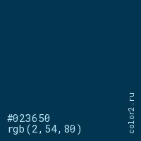 Цвет #023650 в цветовой модели RGB обозначается тремя октетами (2, 54, 80) в десятичном формате и #023650 в шестнадцатиричном (hex) формате, которые являются интенсивностью красного 2 (hex 02), интенсивность зелёного 54 (hex 36) и интенсивность синего 80 (hex 50).