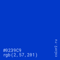 Цвет #0239C9 в цветовой модели RGB обозначается тремя октетами (2, 57, 201) в десятичном формате и #0239C9 в шестнадцатиричном (hex) формате, которые являются интенсивностью красного 2 (hex 02), интенсивность зелёного 57 (hex 39) и интенсивность синего 201 (hex C9).