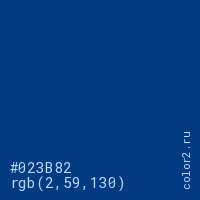 Цвет #023B82 в цветовой модели RGB обозначается тремя октетами (2, 59, 130) в десятичном формате и #023B82 в шестнадцатиричном (hex) формате, которые являются интенсивностью красного 2 (hex 02), интенсивность зелёного 59 (hex 3B) и интенсивность синего 130 (hex 82).