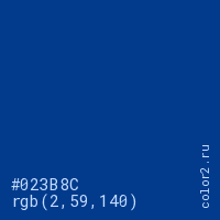 Цвет #023B8C в цветовой модели RGB обозначается тремя октетами (2, 59, 140) в десятичном формате и #023B8C в шестнадцатиричном (hex) формате, которые являются интенсивностью красного 2 (hex 02), интенсивность зелёного 59 (hex 3B) и интенсивность синего 140 (hex 8C).