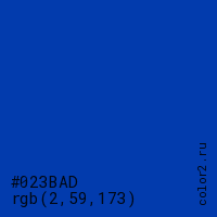 Цвет #023BAD в цветовой модели RGB обозначается тремя октетами (2, 59, 173) в десятичном формате и #023BAD в шестнадцатиричном (hex) формате, которые являются интенсивностью красного 2 (hex 02), интенсивность зелёного 59 (hex 3B) и интенсивность синего 173 (hex AD).