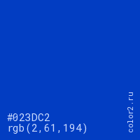 Цвет #023DC2 в цветовой модели RGB обозначается тремя октетами (2, 61, 194) в десятичном формате и #023DC2 в шестнадцатиричном (hex) формате, которые являются интенсивностью красного 2 (hex 02), интенсивность зелёного 61 (hex 3D) и интенсивность синего 194 (hex C2).