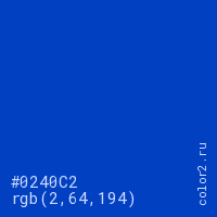 Цвет #0240C2 в цветовой модели RGB обозначается тремя октетами (2, 64, 194) в десятичном формате и #0240C2 в шестнадцатиричном (hex) формате, которые являются интенсивностью красного 2 (hex 02), интенсивность зелёного 64 (hex 40) и интенсивность синего 194 (hex C2).