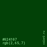 Цвет #024107 в цветовой модели RGB обозначается тремя октетами (2, 65, 7) в десятичном формате и #024107 в шестнадцатиричном (hex) формате, которые являются интенсивностью красного 2 (hex 02), интенсивность зелёного 65 (hex 41) и интенсивность синего 7 (hex 07).