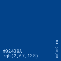 Цвет #02438A в цветовой модели RGB обозначается тремя октетами (2, 67, 138) в десятичном формате и #02438A в шестнадцатиричном (hex) формате, которые являются интенсивностью красного 2 (hex 02), интенсивность зелёного 67 (hex 43) и интенсивность синего 138 (hex 8A).