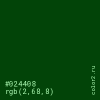 Цвет #024408 в цветовой модели RGB обозначается тремя октетами (2, 68, 8) в десятичном формате и #024408 в шестнадцатиричном (hex) формате, которые являются интенсивностью красного 2 (hex 02), интенсивность зелёного 68 (hex 44) и интенсивность синего 8 (hex 08).