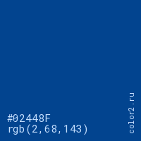 Цвет #02448F в цветовой модели RGB обозначается тремя октетами (2, 68, 143) в десятичном формате и #02448F в шестнадцатиричном (hex) формате, которые являются интенсивностью красного 2 (hex 02), интенсивность зелёного 68 (hex 44) и интенсивность синего 143 (hex 8F).