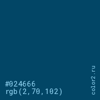 Цвет #024666 в цветовой модели RGB обозначается тремя октетами (2, 70, 102) в десятичном формате и #024666 в шестнадцатиричном (hex) формате, которые являются интенсивностью красного 2 (hex 02), интенсивность зелёного 70 (hex 46) и интенсивность синего 102 (hex 66).