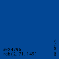Цвет #024795 в цветовой модели RGB обозначается тремя октетами (2, 71, 149) в десятичном формате и #024795 в шестнадцатиричном (hex) формате, которые являются интенсивностью красного 2 (hex 02), интенсивность зелёного 71 (hex 47) и интенсивность синего 149 (hex 95).