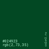 Цвет #024923 в цветовой модели RGB обозначается тремя октетами (2, 73, 35) в десятичном формате и #024923 в шестнадцатиричном (hex) формате, которые являются интенсивностью красного 2 (hex 02), интенсивность зелёного 73 (hex 49) и интенсивность синего 35 (hex 23).