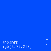 Цвет #024DFD в цветовой модели RGB обозначается тремя октетами (2, 77, 253) в десятичном формате и #024DFD в шестнадцатиричном (hex) формате, которые являются интенсивностью красного 2 (hex 02), интенсивность зелёного 77 (hex 4D) и интенсивность синего 253 (hex FD).