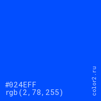 Цвет #024EFF в цветовой модели RGB обозначается тремя октетами (2, 78, 255) в десятичном формате и #024EFF в шестнадцатиричном (hex) формате, которые являются интенсивностью красного 2 (hex 02), интенсивность зелёного 78 (hex 4E) и интенсивность синего 255 (hex FF).
