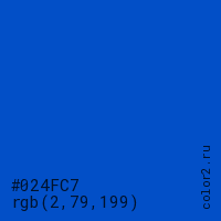 Цвет #024FC7 в цветовой модели RGB обозначается тремя октетами (2, 79, 199) в десятичном формате и #024FC7 в шестнадцатиричном (hex) формате, которые являются интенсивностью красного 2 (hex 02), интенсивность зелёного 79 (hex 4F) и интенсивность синего 199 (hex C7).