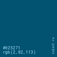 Цвет #025271 в цветовой модели RGB обозначается тремя октетами (2, 82, 113) в десятичном формате и #025271 в шестнадцатиричном (hex) формате, которые являются интенсивностью красного 2 (hex 02), интенсивность зелёного 82 (hex 52) и интенсивность синего 113 (hex 71).