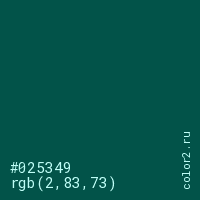 Цвет #025349 в цветовой модели RGB обозначается тремя октетами (2, 83, 73) в десятичном формате и #025349 в шестнадцатиричном (hex) формате, которые являются интенсивностью красного 2 (hex 02), интенсивность зелёного 83 (hex 53) и интенсивность синего 73 (hex 49).