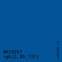 Цвет #025397 в цветовой модели RGB обозначается тремя октетами (2, 83, 151) в десятичном формате и #025397 в шестнадцатиричном (hex) формате, которые являются интенсивностью красного 2 (hex 02), интенсивность зелёного 83 (hex 53) и интенсивность синего 151 (hex 97).