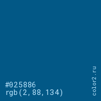 Цвет #025886 в цветовой модели RGB обозначается тремя октетами (2, 88, 134) в десятичном формате и #025886 в шестнадцатиричном (hex) формате, которые являются интенсивностью красного 2 (hex 02), интенсивность зелёного 88 (hex 58) и интенсивность синего 134 (hex 86).
