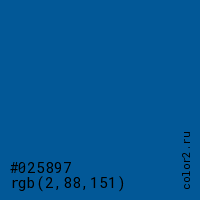 Цвет #025897 в цветовой модели RGB обозначается тремя октетами (2, 88, 151) в десятичном формате и #025897 в шестнадцатиричном (hex) формате, которые являются интенсивностью красного 2 (hex 02), интенсивность зелёного 88 (hex 58) и интенсивность синего 151 (hex 97).