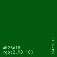 Цвет #025A10 в цветовой модели RGB обозначается тремя октетами (2, 90, 16) в десятичном формате и #025A10 в шестнадцатиричном (hex) формате, которые являются интенсивностью красного 2 (hex 02), интенсивность зелёного 90 (hex 5A) и интенсивность синего 16 (hex 10).