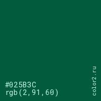 Цвет #025B3C в цветовой модели RGB обозначается тремя октетами (2, 91, 60) в десятичном формате и #025B3C в шестнадцатиричном (hex) формате, которые являются интенсивностью красного 2 (hex 02), интенсивность зелёного 91 (hex 5B) и интенсивность синего 60 (hex 3C).