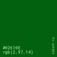 Цвет #02610E в цветовой модели RGB обозначается тремя октетами (2, 97, 14) в десятичном формате и #02610E в шестнадцатиричном (hex) формате, которые являются интенсивностью красного 2 (hex 02), интенсивность зелёного 97 (hex 61) и интенсивность синего 14 (hex 0E).