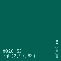 Цвет #026153 в цветовой модели RGB обозначается тремя октетами (2, 97, 83) в десятичном формате и #026153 в шестнадцатиричном (hex) формате, которые являются интенсивностью красного 2 (hex 02), интенсивность зелёного 97 (hex 61) и интенсивность синего 83 (hex 53).