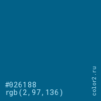 Цвет #026188 в цветовой модели RGB обозначается тремя октетами (2, 97, 136) в десятичном формате и #026188 в шестнадцатиричном (hex) формате, которые являются интенсивностью красного 2 (hex 02), интенсивность зелёного 97 (hex 61) и интенсивность синего 136 (hex 88).